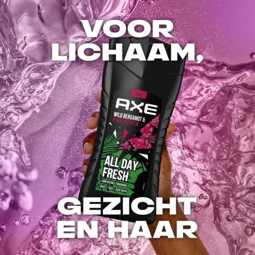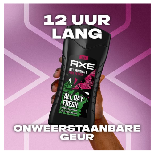 AXE Wild Bergamot & Pink Pepper 3-in-1 Douchegel zorgt voor een verfrissende en relaxte verzorging en reiniging van je lichaam, gezicht en haar en laat je tot 12 uur onweerstaanbaar ruiken. AXE Wild Bergamot & Pink Pepper 3-in-1 Douchegel met de elegante, gedurfde geur van bergamotolie, eikenhout en roze peper bevat 100% plantaardige moisturizers en is dermatologisch getest. Heb je onze frisse, geüpdate look gezien? Dat is niet het enige wat er verbeterd is. Onze revolutionaire technologie met dubbele werking bestrijdt de geur veroorzakende bacteriën, waardoor je dag en nacht onweerstaanbaar ruikt. Dus wat er ook op je pad komt, je bent er klaar voor. Maak je geen zorgen, we hebben niet geknoeid met de klassieke AXE Wild Bergamot & Pink Pepper geur. We weten dat die al perfect is. Geniet je van deze geur? Probeer dan ook eens de AXE Wild Bergamot & Pink Pepper Deodorant Bodyspray.