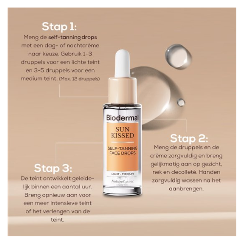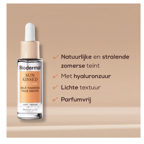 Biodermal Self-Tanning Face Drops geven de huid geleidelijk een natuurlijke zomerse teint. De parfumvrije formule heeft een lichte textuur en is speciaal ontwikkeld om door een dag- of nachtcrème naar keuze te gebruiken. Geformuleerd met hydraterend hyaluronzuur voor een stralende huid. Geschikt voor alle huidtinten.