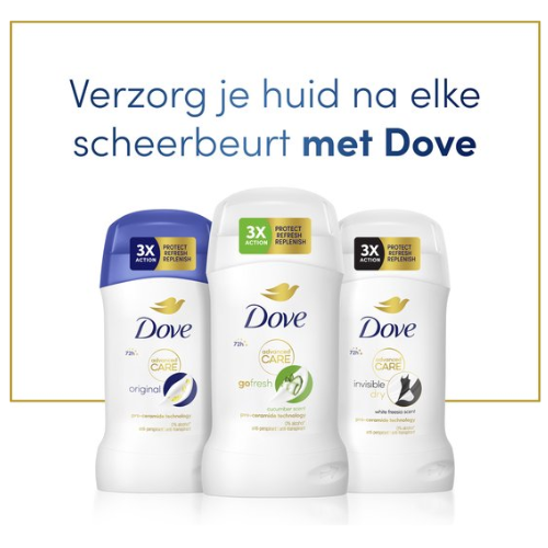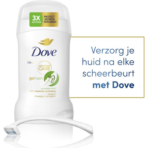 Dove Advanced Care Go Fresh Cucumber Anti-Transpirant Stick helpt de huid na het scheren te herstellen en biedt tot 72 uur bescherming tegen zweet en lichaamsgeur.