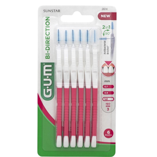 De GUM® Bi-Direction 1.2 is de grootste rager in het bi-direction assortiment. De Gum bi-direction heeft een slim ontwerp waarmee je hem in 2 posities kan zetten; 90° of 180°. Deze borsteltjes zijn vooral handig om tussen de tanden te reinigen, zowel bij nauwe als bij grotere ruimtes. Ook kun je ze gebruiken bij bruggen, implantaten of orthodontische apparatuur.