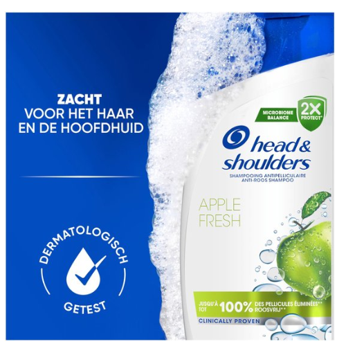 Head & Shoulders Apple Fresh anti-roos shampoo voor elk haar- en hoofdhuidtype werkt zelfs tegen hardnekkige roos. Een shampoo geschikt voor dagelijks gebruik voor zowel mannen als vrouwen, met een frisse appelgeur en microbioombalansformule die de hoofdoorzaak van roos aanpakt en het microbioom van de hoofdhuid in balans houdt. Werkt zowel tegen zichtbare als onzichtbare roos door 2x meer beschermende ingrediënten vrij te geven die zich in de poriën vastzetten om uiteindelijk te voorkomen dat hardnekkige roos terugkomt. De formule is klinisch bewezen, dermatologisch getest en heeft een evenwichtige pH waardoor je haar en hoofdhuid schoon en fris aanvoelen.