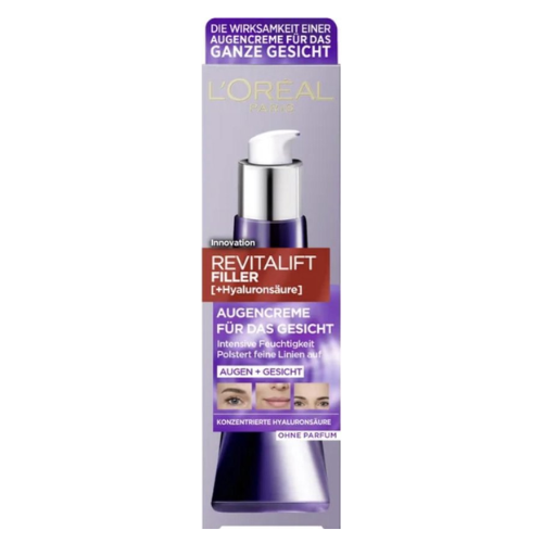 Eye cream for the face with concentrated hyaluronic acid Cushions fine lines, softens and hydrates The skin is more hydrated, smoother and plumper The effectiveness of an eye cream for the entire face Fragrance-free and alcohol-free The L'ORÉAL PARIS Revitalift Filler [+ hyaluronic acid] eye cream for the face with concentrated hyaluronic acid intensively hydrates the skin and fills in fine lines. After the first application, the skin feels more hydrated and supple, after 4 weeks fine lines are softened and the skin looks fuller. It has the effectiveness of an eye cream for the entire face and is suitable for skin from approx. 30 to 59 years.