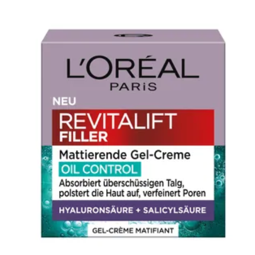 Tot 8 uur lang een anti-glanseffect! De Revitalift Filler Mattifying Gel Cream Oil Control van L'Oréal Paris vermindert de eerste tekenen van huidveroudering op de vette huid. Het diepwerkende werkstoffencomplex van hyaluronzuur en salicylzuur absorbeert overtollig talg, verfijnt de poriën en maakt de huid van binnenuit voller - voor een mattere en egalere teint. Dankzij de ultralichte en olievrije geltextuur wordt de gezichtscrème snel opgenomen en smelt hij onmiddellijk in de huid - zonder een vettig laagje achter te laten.