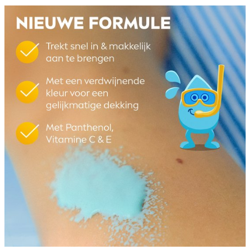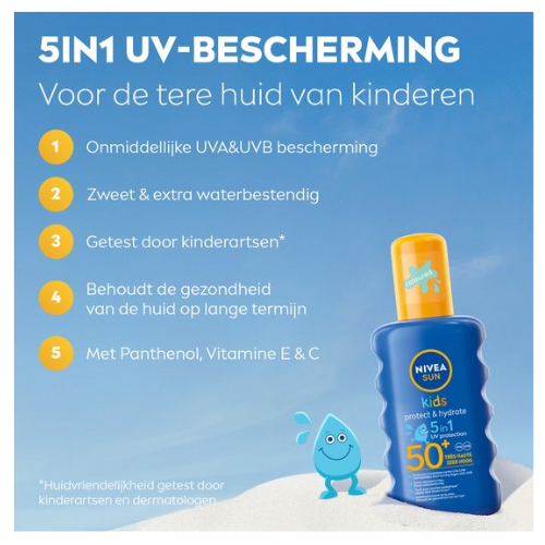 De NIVEA SUN Kids Protect & Care Gekleurde Spray SPF50+ biedt onmiddellijke UVA- en UVB-bescherming. Het houdt de tere kinderhuid gezond en helpt verbranding en UV-beschadiging op lange termijn te voorkomen. Deze zonnebrand is extra waterbestendig om actieve kinderen betrouwbaar te beschermen tijdens leuke momenten buiten. De verbeterde formule combineert ingrediënten zoals Panthenol, Vitamine E & C en is afgestemd op de huidbehoeften van kinderen. Het ondersteunt de beschermende barrière van de huid en voorkomt uitdroging van de huid. De formule heeft een verdwijnende kleur voor een gelijkmatige dekking. Trekt snel in! *Huidvriendelijkheid getest door kinderartsen en dermatologen
