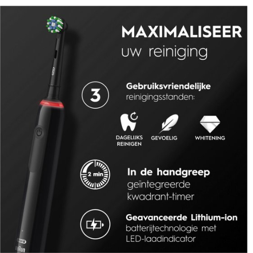 - Optimaliseer uw reiniging met 3 eenvoudige poetsstanden en een geïntegreerde kwadranttimer die elke 30 seconden aangeeft dat u het volgende gebied in jouw mond moet gaan poetsen