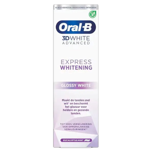 De Oral-B 3D White Advanced Express Whitening Glossy White Tandpasta is uitgerust met de Oral-B whitening-technologie. De tandpasta maakt witter door oppervlakkige verkleuringen vanaf de eerste poetsbeurt te verminderen, verwijdert tot 100% van de oppervlakkige verkleuringen in vijf dagen en beschermt je tanden tegen zuren en toekomstige oppervlakkige verkleuringen. Voordelen van de Oral-B 3D White Advanced Express Whitening Glossy White Tandpasta: * Maakt je tanden snel witter door oppervlakkige verkleuringen te verwijderen * Beschermt je glazuur voor stralend witte en gezonde tanden * Tandpasta met een eucalyptusmuntsmaak * Klinisch bewezen, professioneel ontwikkeld * Doosje en tube zijn recyclebaar, meer informatie op de website van Oral-B. Gebruikersbeperkingen Gebruik voor kinderen van zes jaar of jonger niet meer tandpasta dan de grootte van een erwt. Zorg dat ze zo weinig mogelijk tandpasta inslikken. Raadpleeg een (tand)arts als u fluoride in een andere vorm gebruikt. Samenstelling Ingrediënten: Glycerin, Hydrated Silica, Sodium Hexametaphosphate, Aqua, PEG-6, Aroma, Trisodium Phosphate, Sodium Lauryl Sulfate, Cocamidopropyl Betaine, Sodium Saccharin, Sodium Fluoride, Pvp, Xanthan Gum, Carrageenan, Sodium Chloride, Sucralose, Sodium Benzoate, Sodium Hydroxide, CI 74260, Citric Acid, Sodium Citrate, Potassium Sorbate. Bevat natriumfluoride (1450 ppm Fluoride).